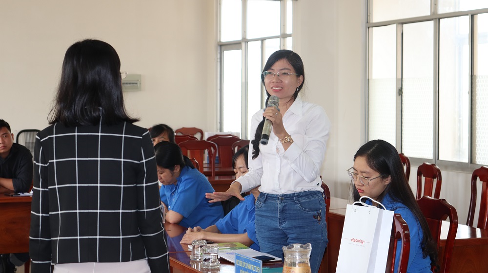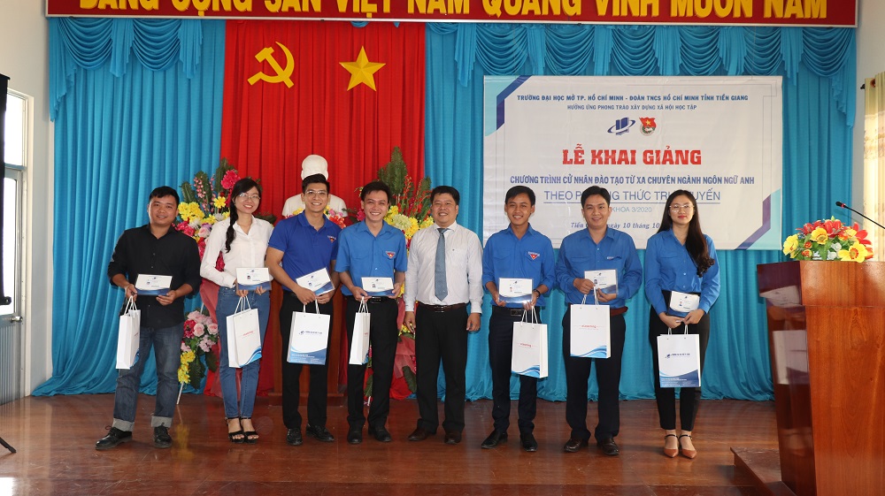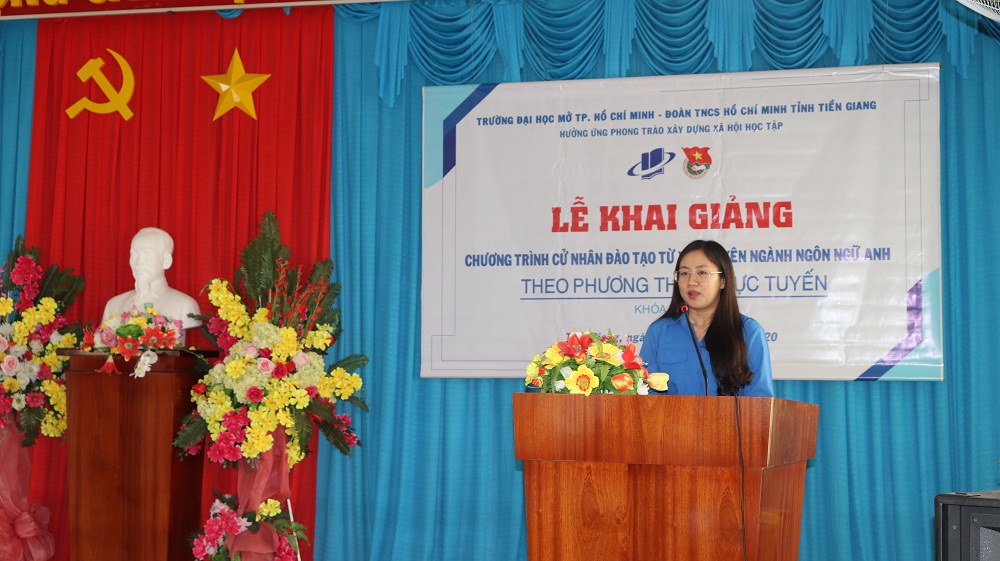 At the ceremony, the representatives of Tien Giang Provincial Youth Union were Mrs. Nguyen Thi Uyen Trang – Member of the Standing Committee of the Central Committee of the Youth Union, Provincial Member, Secretary of the Provincial Youth Union, and Mrs. Nguyen Thi My Huong – Deputy Secretary – Chairman of the Committee of the Vietnam Youth Union in Tien Giang province. Representatives of the Open University of Ho Chi Minh City were Ph.D. Le Nguyen Quoc Khang – Vice-Rector of the University, Ph.D. Phan Thi Ngoc Thanh – Director of Online Training Center, MSc. Nguyen Ngoc Thong – Deputy Director. The program has the participation of new students majoring in English, the 03/2020 course’s students, all union members, and young people in the province.